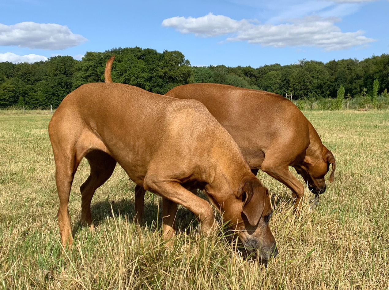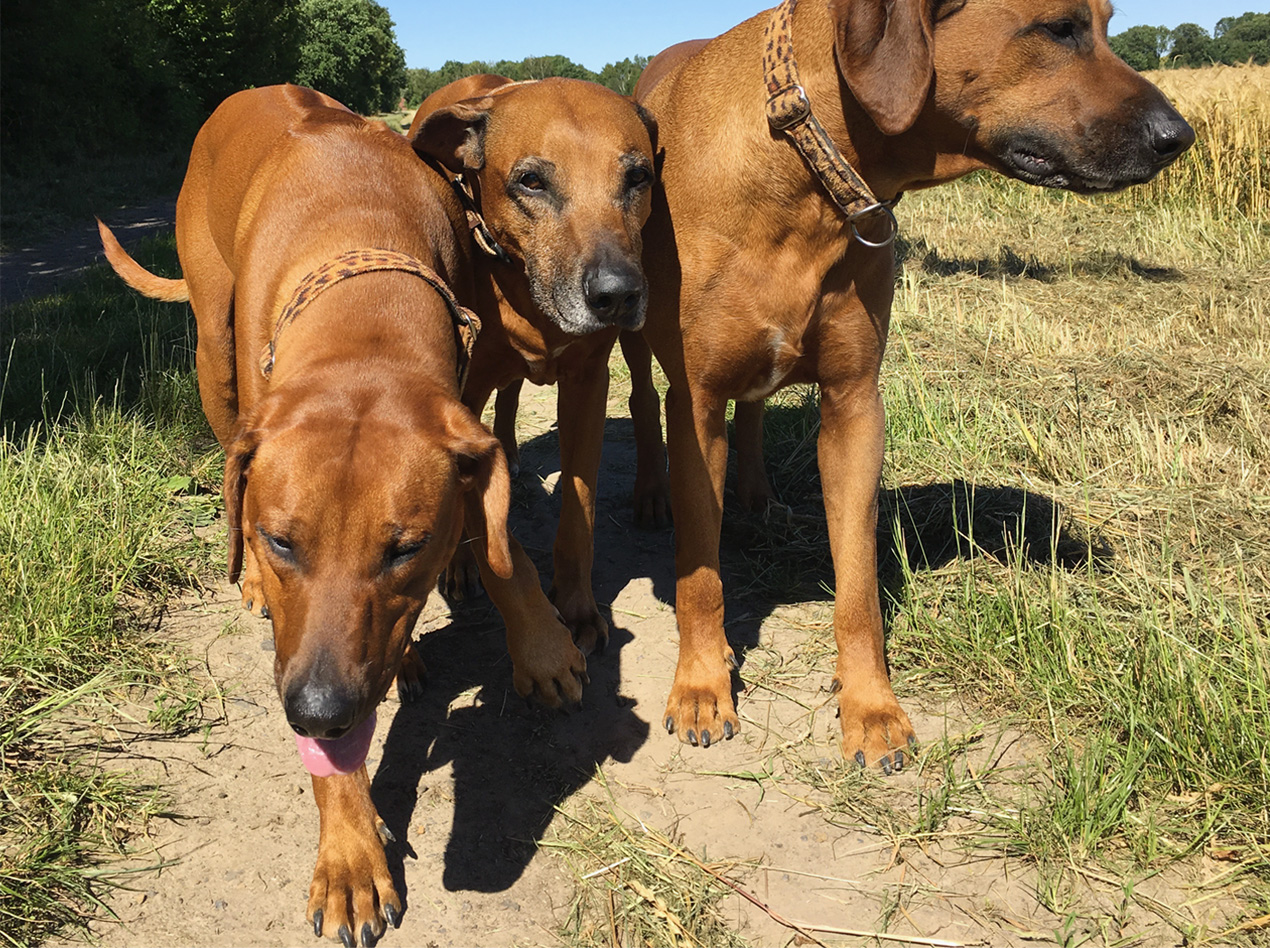 Mit unserer Hündin Imara Themba haben wir 2013 einen ersten Wurf gewagt und wollten auf jeden Fall einen Welpen behalten. Unsere Wahl fiel auf die Letztgeborene. Afra, so heißt sie, hat sich zu einer prächtigen Hündin entwickelt. Eine Zeit lang gehörte noch Akim, ein stattlicher Rüde zu unserem Rudel. Auch Afra hat uns im Jahr 2017 einen Wurf geschenkt, aus dem zwei Welpen bei uns geblieben sind. Nunmehr leben Afra, deren schlaue Tochter Bayo Blanka und ihr ausgeglichen freundlicher Sohn Bhengu Adnan Moyo mit uns im Mittelbrinker Forsthaus. Die drei haben sich zu einem wunderbaren Team entwickelt, das einen überallhin begleiten kann. Was will man mehr.